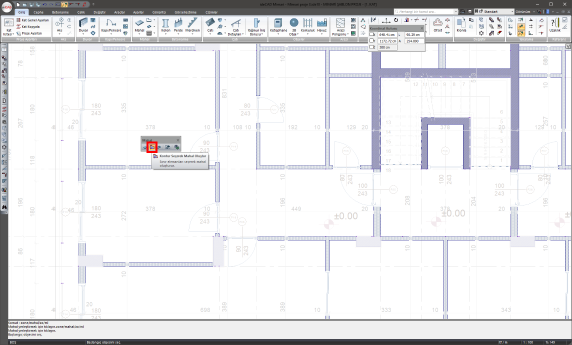 Mahal toolbarından Kontur seçerek mahal oluştur ikonuna tıklayın.