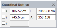 Koordinat sistemi X (apsis), Y (ordinat), A(açı), L(uzunluk) parametreleriyle kullanılır. Bu parametrelerin kullanıldığı araç, koordinat kutusudur. İmleç hareket ettikçe koordinat kutusu üzerinde bulunan değerler de değişir. İmlecin koordinat bilgileri, koordinat kutusundan izlenir.
