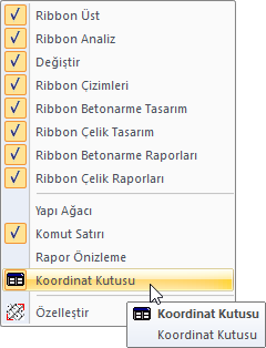 Eğer açık değilse herhangi bir toolbar üzerinde farenin sağ tuşu tıklanıp açılan menüden Koordinat Kutusu satırı işaretlenerek koordinat kutusu açılır.
