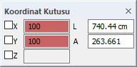 Koordinat kutusunda yer alan X (apsis), Y (ordinat), A(açı), L(uzunluk) parametreleri yapılan işlem ve imleç hareketine bağlı olarak, orijin(0,0) noktası referans alınarak değişir. Veri girişi koordinat kutusuna değerler girilerek yapılabileceği gibi koordinat kutusunu kullanmadan dinamik bilgi girişi kullanılarak obje tanımlama esnasında da yapılabilir.