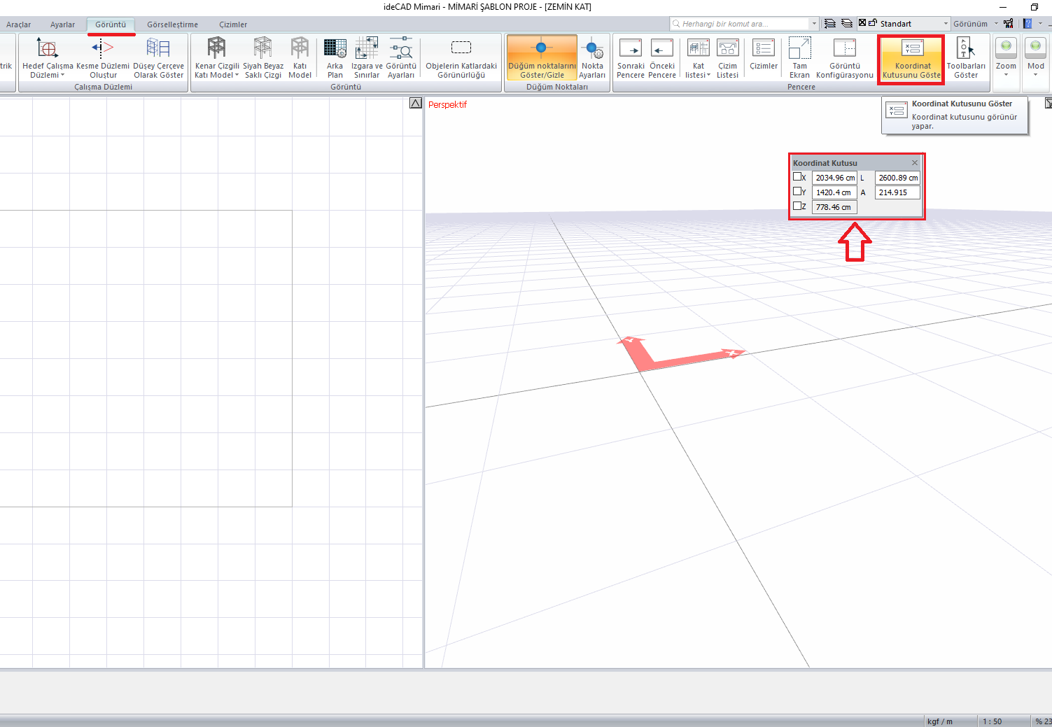 Kaybolan koordinat kutusu "Koordinat Kutusunu Göster" komutuyla geri getirilir.