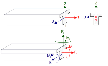 Plandaki bir kirişe bakıldığında kirişe paralel eksen 1 ekseni, planda ona dik eksen 3 ekseni ve çalışma düzlemine dik düşey eksen 2 ekseni olarak düşünülmelidir. Sol uç i, sağ uç ise j'dir.