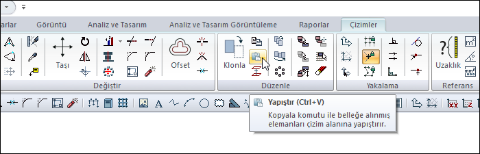 ideCAD’de objeleri, aynı katta veya çizim paftasında, bir kattan diğer bir kata veya bir çizim paftasından başka bir çizim paftasına kopyalama işlemi için önce Kopyala(CTRL+C) ve ardından Yapıştır (CTRL+V) komutları kullanılır.