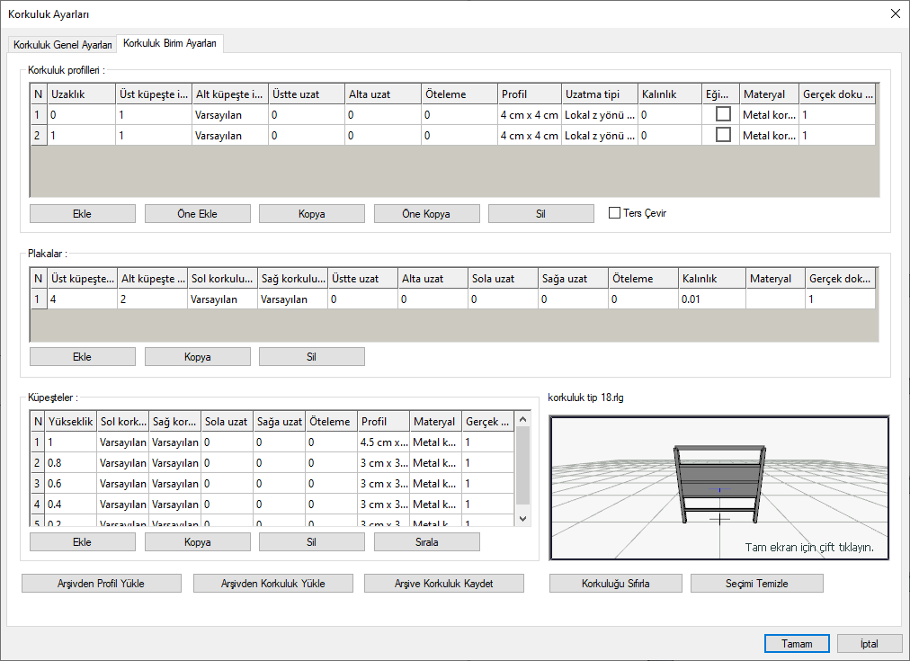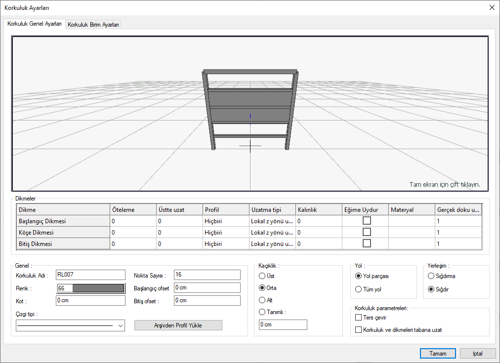 Korkuluk Ayarları komutuyla korkuluk kotu, tipi, materyali, küpeşte, dikme ve plaka ayarlarına ulaşılır.