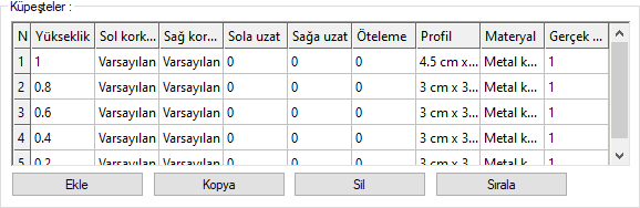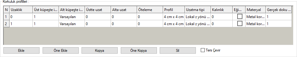 Korkuluk profilleri ![]() Korkuluk bu tabloda yapılır. Her bir korkuluk profili tabloda bir satır olarak tanımlanır. |