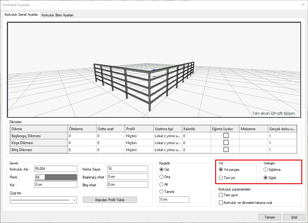 Korkuluk ayarları diyaloğu korkuluk genel ayarları sekmesinden yol ve yerleşim ayarlarına ulaşabilirsiniz.