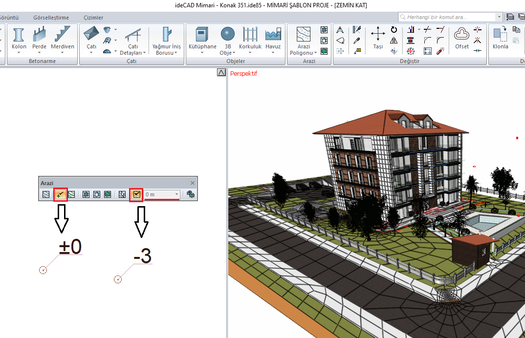 “Kot noktası” komutuyla, arazi toolbarında bulunan kot kutucuğuna, bir kot değeri girilerek arazi üzerinde tıklanan noktada bir kot noktası oluşturulur.