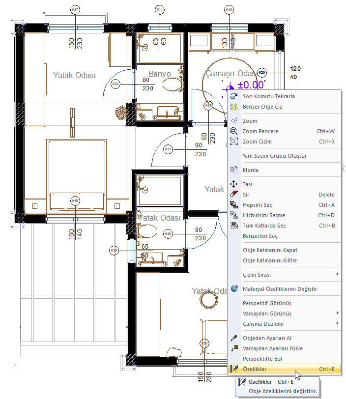 Ayarlarına girmek istediğiniz kot ölçülendirmeyi seçin farenin sağ tuşuna tıklayarak açılan menüden Özellikler satırına tıklayın.