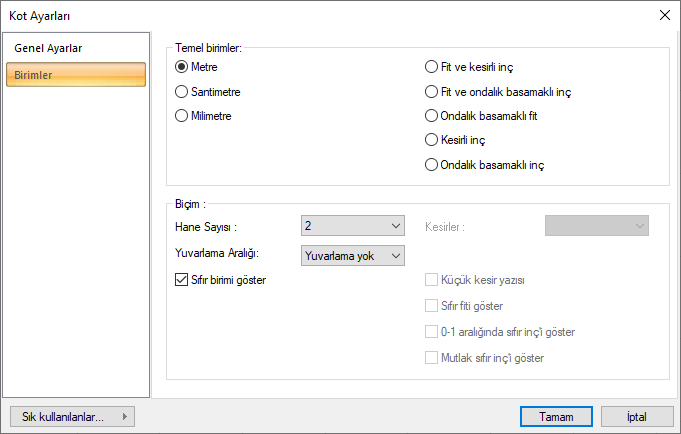 Temel birimler ![]() Seçimlerden biri farenin sol tuşu işe tıklanarak etkin hale getirilir. Metre: İşaretlenirse, bilgi yazısının birimi metre olur. |