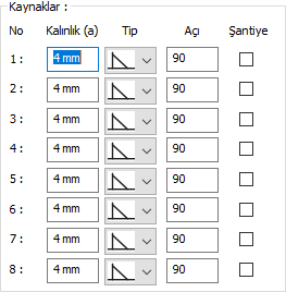 Kaynaklar ![]() Birleşim yerlerine yapılacak kaynakların kalınlık, tip ve açı değerleri verilir. Şantiyede yapılıp yapılmayacağı bilgisi girilir. |