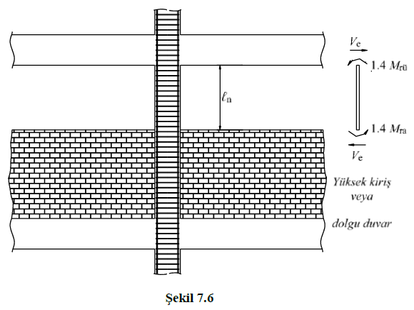 Denk.(7.5)’teki eğilme momentleri, kısa kolonun alt ve üst uçlarında Ma ≈ 1.4Mra ve Mü ≈ 1.4Mrü olarak hesaplanacak, ln ise kısa kolonun serbest boyu olarak alınacak ve hesaplanan kesme kuvveti Denk.(7.7)’de verilen koşulları sağlayacaktır.