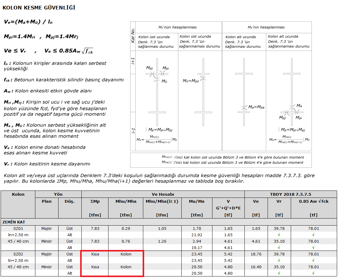 Kısa kolon olarak tanımlanan kolonların tasarımı raporlanması otomatik yapılır. Kısa kolon olarak seçilen kolonlar kesme güvenliği raporunda “Kısa Kolon“ olarak belirtilir.