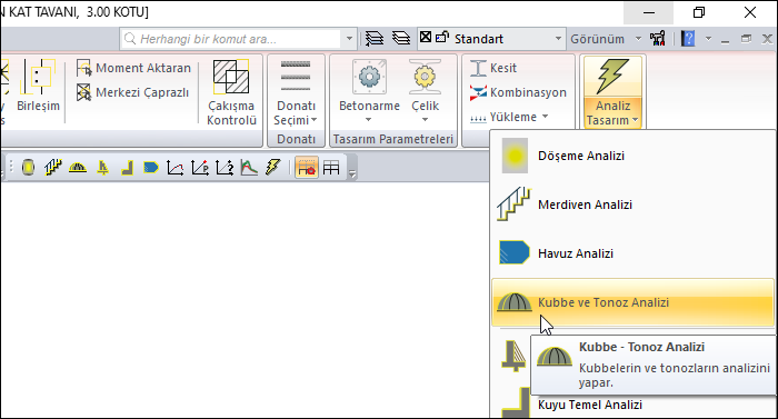 Analiz Tasarım ikonu altında bulunan Kubbe ve Tonoz Analizi ikonunu tıklayınız.