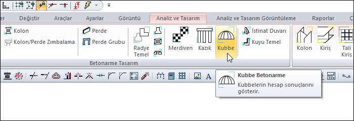 Analizden sonra, ribbon menü Analiz ve Tasarım sekmesi Betonarme Tasarım başlığı altından Kubbe komutuna tıklayarak ulaşabilirsiniz.