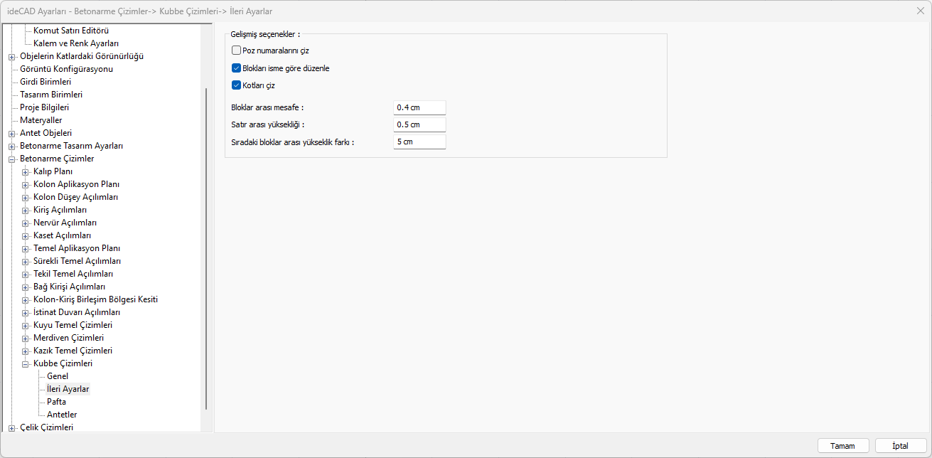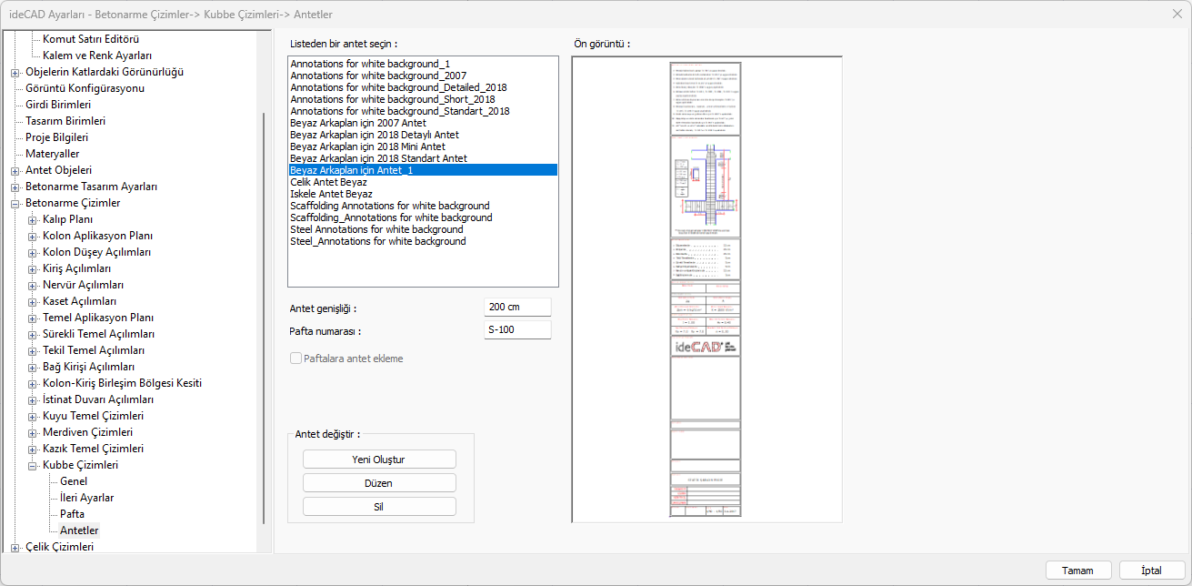 Kubbe çizimlerine ait yazıların renk, büyüklük ve tip, pafta ve antet ayarları düzenlenir.