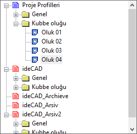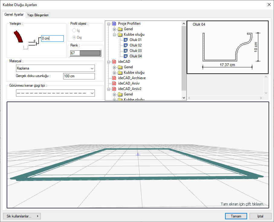 Proje profilleri ![]() Kubbe oluğuna ait profillerin listesidir. Seçilen profil çevreleme elemanında kullanılacaktır. Profil ön görüntüsü sağ tarafta çizilmektedir. |