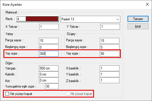Küre Objesi Yay Açısı ve Yüzey Ayarı