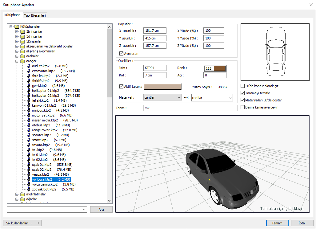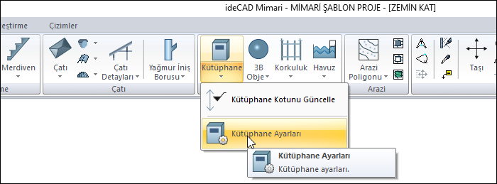 Kütüphane Ayarları komutuyla kütüphane tipi seçimi, boyut, kot ve materyal seçimi gibi ayarlara ulaşılır.