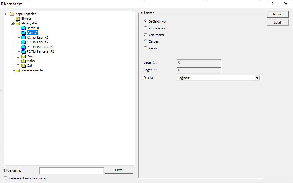 Tamam butonu tıklayın. “Bileşen Seçimi” diyaloğu kapanacaktır. Yapı Bileşenleri sekmesinde malzemeye ait özet bir satır görünecektir. Bir objeye birden fazla malzeme ataması yapılabilir.