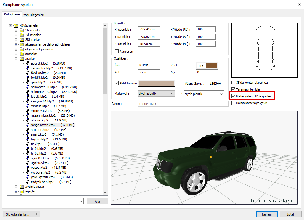 Materyalleri 3B’de göster özelliğiyle kütüphane ayarları diyaloğunda seçili kütüphane, öngörüntü bölümünde materyalleri ile beraber gösterilir.