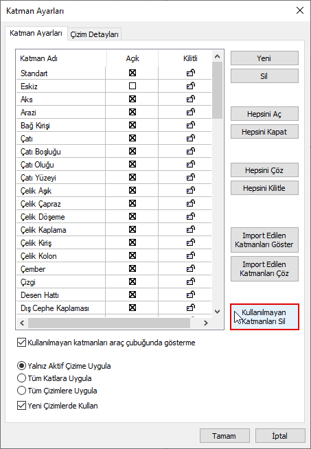 "Kullanılmayan katmanları sil" özelliği ile kullanılmayan katmanlar tek seferde silinir.