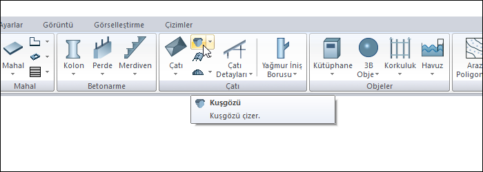 Kuşgözü komutuyla çatı üzerine kuşgözü tanımlanır. Kuşgözü tanımlamak için önce çatı tanımlanmalıdır.