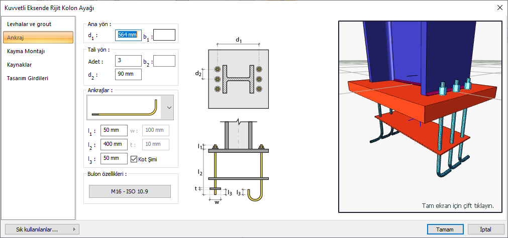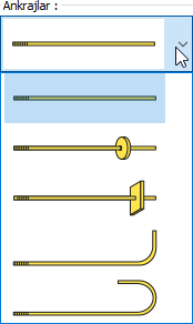 Ankrajlar ![]() ![]() Listeden ankraj tipi seçilir. Ankraj boyutları değerler girilerek belirlenir. Girilecek değerler şematik çizimde gösterilmektedir. |