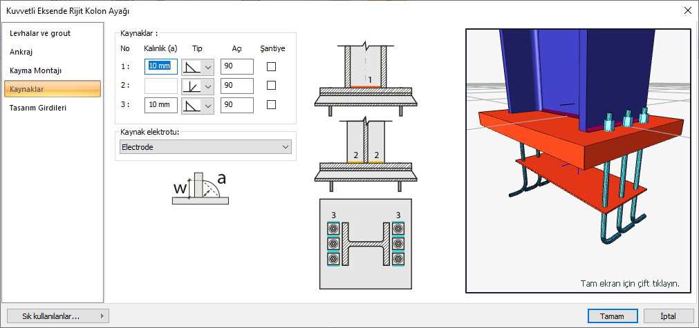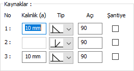 Kaynaklar ![]() Birleşim yerlerine yapılacak kaynakların kalınlık, tip ve açı değerleri verilir. Şantiyede yapılıp yapılmayacağı bilgisi girilir. |