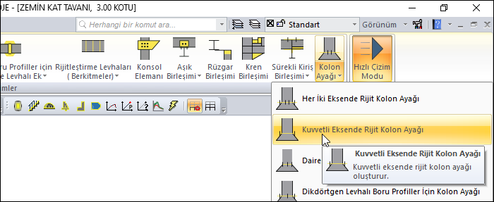 Çelik menüsünden Kuvvetli Eksende Rijit Kolon Ayağı satırını tıklayın.
