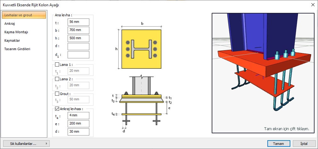 Ankraj levhası ![]() Ankraj levhası değer girilerek belirlenir. Girilecek değerler şematik çizimde gösterilmektedir. |