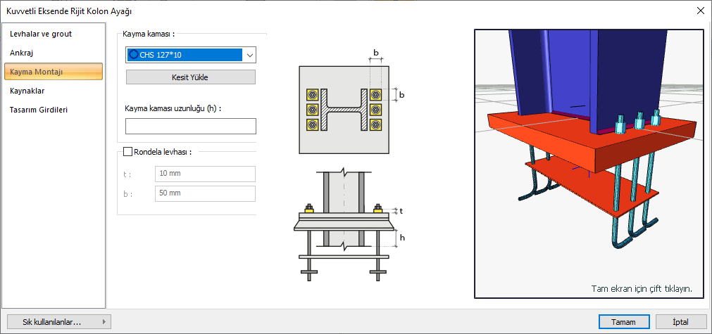 Kuvvetli Eksende Rijit Kolon Ayağı komutu ile çelik kolon-temel birleşimi tanımlanır.