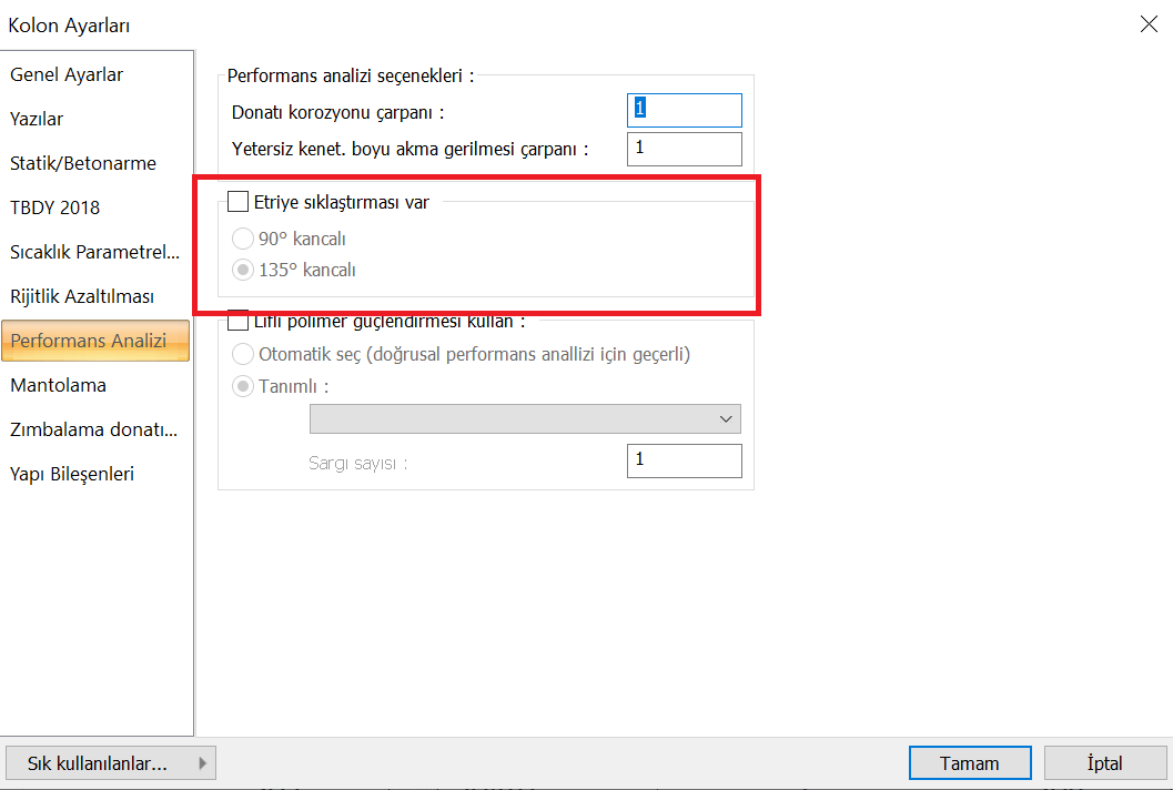 Lifli polimer sargı uygulanmadan yapılan doğrusal performans analizinde SZ01 kolonun etriye ile sargı etkisi olmadığı kabul edilecektir. Bu sebeple kolon ayarlarından Etriye sıklaştırması var seçeneği etkisiz hale getirilmiştir.