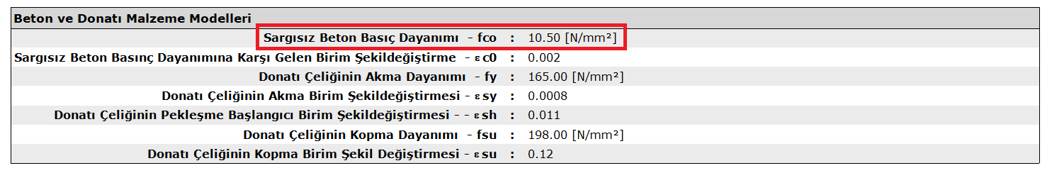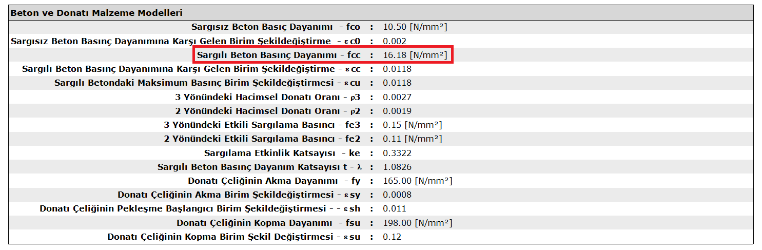 olarak hesaplanır. Moment-eğrilik analizini raporunda hesaplanan fco değeri aşağıda gösterilmiştir.