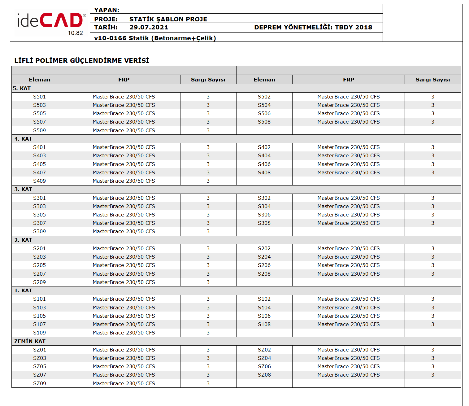 Lifli polimer güçlendirmesi kullan seçeneğini aktif hale geldiğinde TBDY EK 15B 'de tanımlanan kesme kuvveti katkısı ve eksenel basınç dayanımının ve eleman sünekliğinin arttırılması uygun şekilde yapılmaktadır. Lifli Polimer Güçlendirme Verisi raporunda sargı sayısı ve FRP tipinin adı görülebilir.