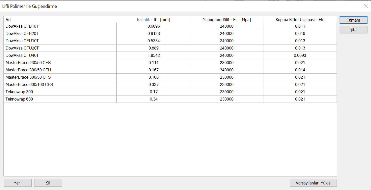 Lifli Polimer Güçlendirme Kütüphanesi komutu kullanılarak FRP sargı tiplerini, kalınlık, Elastisite modülü ve kopma birim uzaması değerlerini kontrol edebilir veya yeni FRP tipleri tanımlayabilirsiniz.