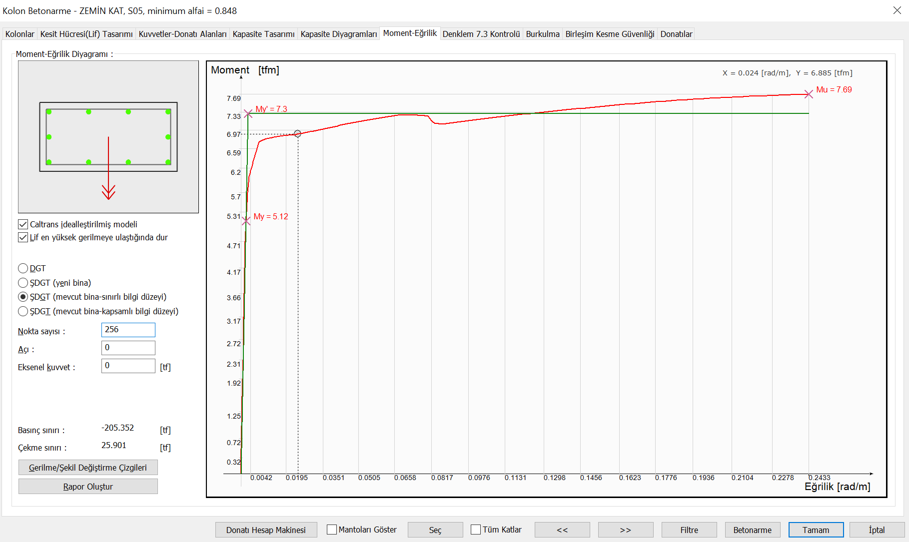 Lifli polimer güçlendirmesi kullan seçeneği ile FRP tanımlanan bir elemanın ŞDGT (mevcut bina-sınırlı bilgi düzeyi) ve ŞDGT (mevcut bina-kapsamlı bilgi düzeyi) moment eğrilik analizi seçeneklerinde TBDY 15B.2 ve 15B.3 'de tanımlanan malzeme değerleri kullanılmaktadır. Performans analizi içerisinde de TBDY Ek 15B 'ye uygun şekilde tanımlanmış akma değerleri ile kayma dayanımları kullanılmaktadır.