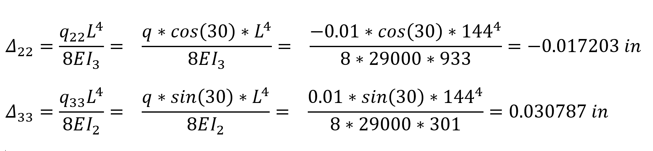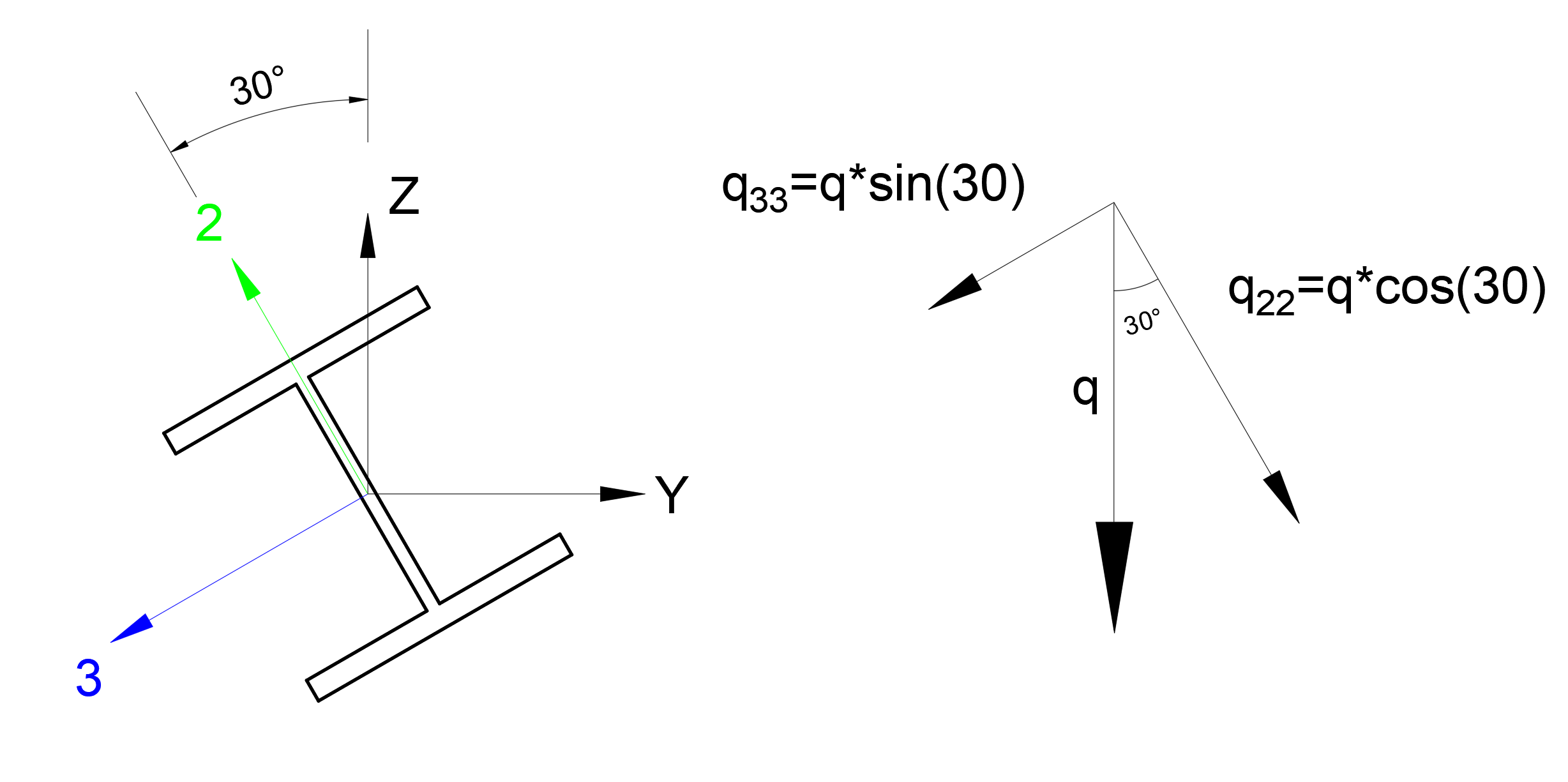 Yayılı yükleme durumu global Z eksenine göre q=-0.01 k/ft olarak tanımlanmıştır. Bu durumda q yayılı yükleme durumunun elemanın 3 eksenindeki (lokal eksen) bileşeni q33 = q*sin(30) olacaktır. Benzer şekilde q yayılı yükleme durumunun elmanın 2 eksenindeki (lokal eksen) bileşeni q22 = q*cos(30) olacaktır.