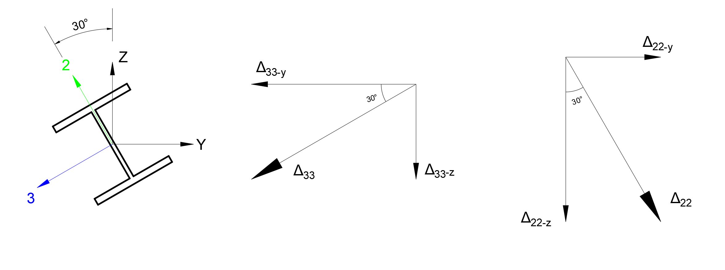 Yukarıdaki bağıntılarda Δ22 elemanın lokal eksenine göre 2 yönündeki yerdeğiştirmesi, Δ33 elemanın lokal eksenine göre 3 yönündeki yerdeğiştirmesidir. Bu değerleri global eksenlere çevirmek için aşağıdaki işlemler uygulanabilir.