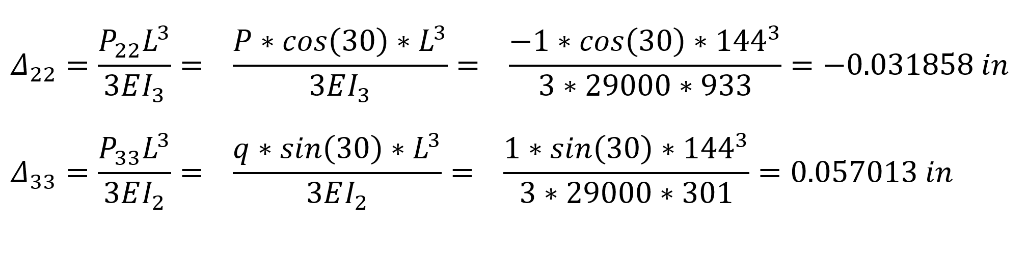 Yukarıdaki bağıntılarda Δ konsol elemanın uç yerdeğiştirme değeri, L konsol eleman uzunluğu, E elastisite modülü, I atalet momenti, q düzgün yayılı yük değeri, P tekil yük değeri ve M tekil moment değeridir. Durum 1, Durum 2 ve Durum 3 için yukarıdaki bağıntılar kullanılabilir. Ancak konsol eleman açılı olarak tanımlandığı ve yük değerleri global eksenlere tanımlandığı için hem Y hem de Z ekseninde ilgili atalet momentleri kullanılarak yukarıdaki bağıntılar hesaplanmalıdır.