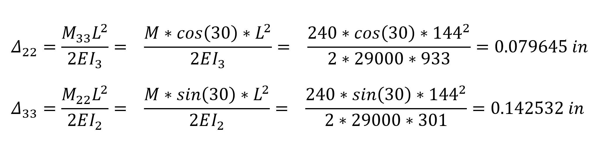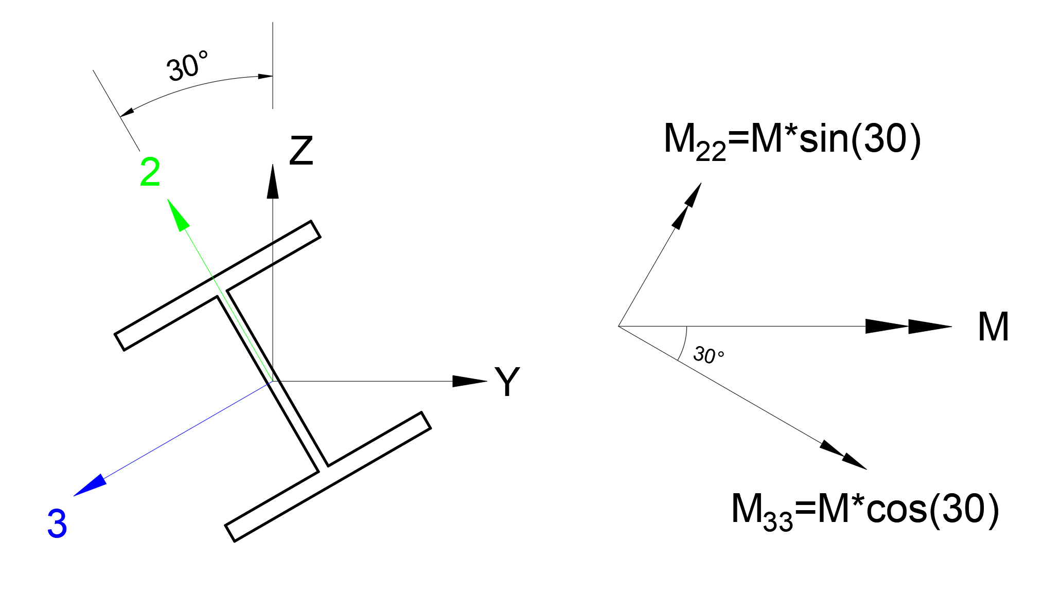 Tekil moment yükleme durumu global Y ekseni etrafında M=240 k-in olarak tanımlanmıştır. Bu durumda M tekil moment yükleme durumunun elemanın 3 ekseni etrafındaki (lokal eksen) bileşeni M33 = M*cos(30) olacaktır. Benzer şekilde M tekil moment yükleme durumunun elmanın 2 ekseni etrafındaki (lokal eksen) bileşeni M22 = M*cos(30) olacaktır.