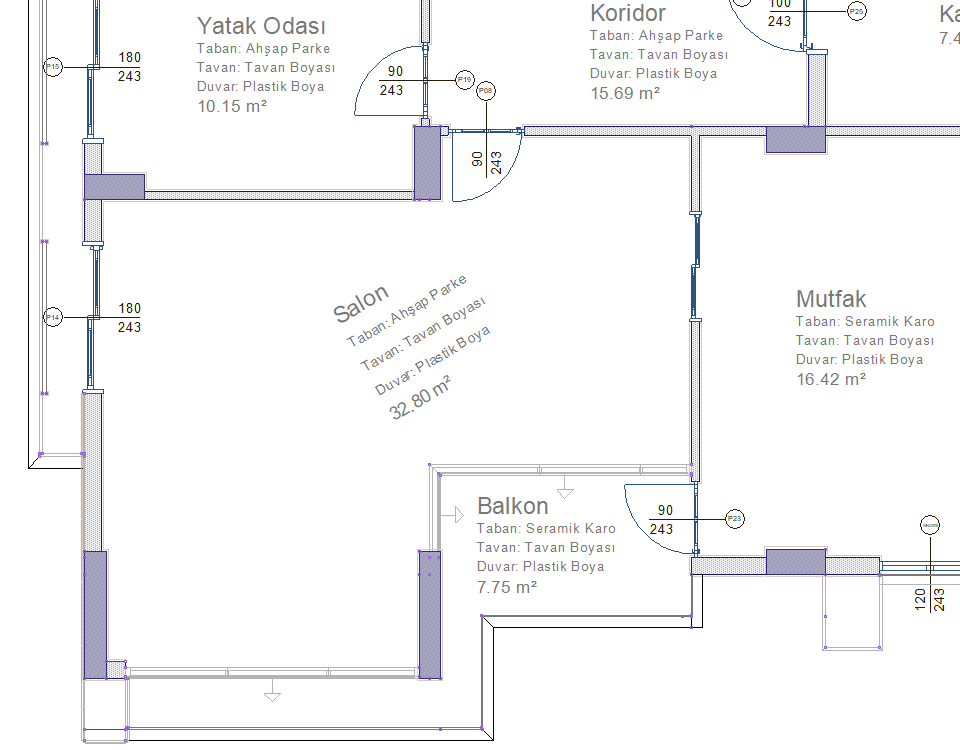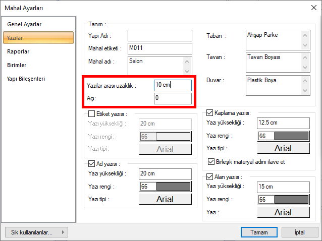 Yazılar arası uzaklık ve açı özellikleriyle mahal yazıları arasındaki mesafe değiştirilir, yazılar açı değeri girilerek döndürülür.