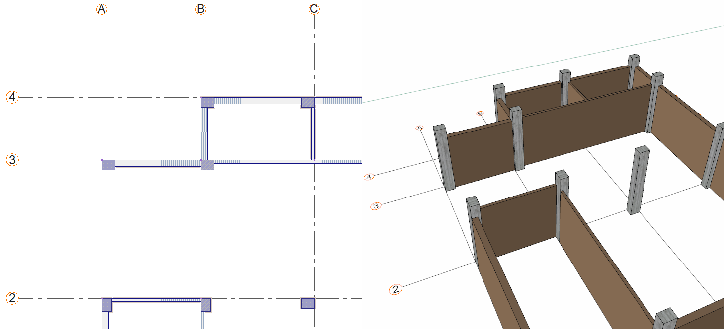 İlk olarak A düşey aksı üzerinde 2 ve 3 aksları arasında yer alan duvarı silin. İleriki adımlarda buraya giydirme cephe tanımlayacaksınız.