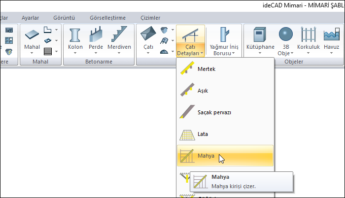 Mahyalar çatı yüzeylerinin bir doğru boyunca kesiştiği ara kesittir. Birbirine paralel olmayan saçaklardan yükselen çatı yüzeylerinin kesişmesi ile mahyalar ortaya çıkar. Mahya komutuyla mahya çatı detayı oluşturulur. Mahyalar çatı kırım hatları üzerine tek tıklama ile oluşturulur.