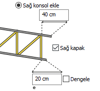 ![]() Sağ konsol ekle bölümünden makasın sağ üst ve alt başlıklarına farklı değerler vererek konsol eklenir. Dengele seçeneğini işaretleyerek alt başlığa verilen değer üst başlığa da uygulanır. Sağ kapak seçeneği işaretlenerek konsolun ucuna kapak eklenir. | |