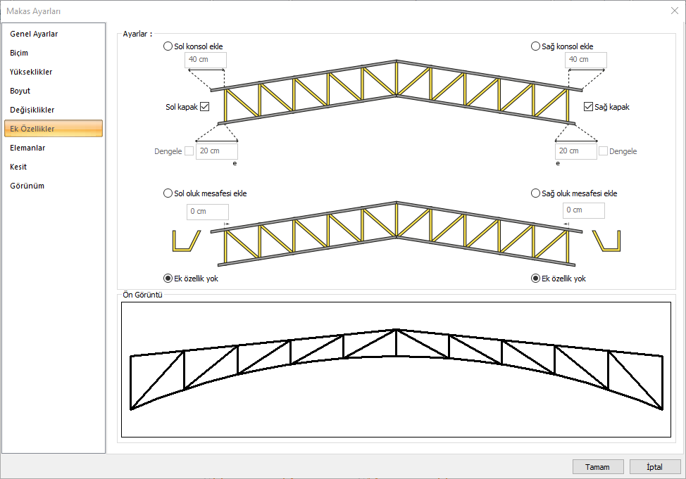 Makas komutuna tıklandığında açılan Makas toolbarından Ayarlar ikonuna tıklayarak Makas Ayarları diyaloğuna ulaşabilirsiniz. Makas oluk ve konsol ayarları Ek Özellikler sekmesinde yer almaktadır.