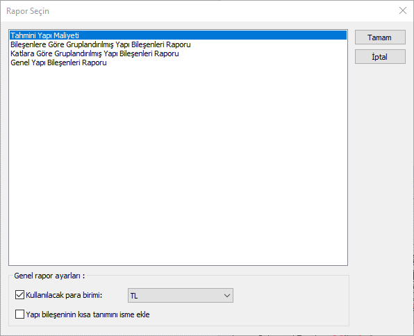 Yapı bileşenleri metrajı komutu tıklandığında açılan Rapor Seçin diyaloğundan ulaşabilirsiniz.