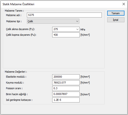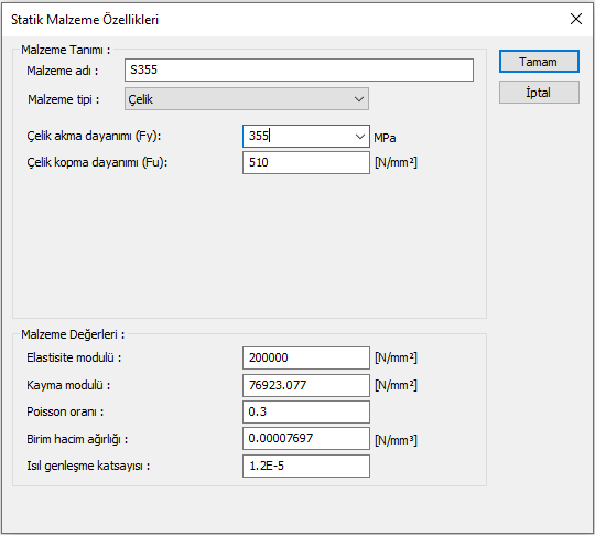 ideCAD Statik ile malzeme düzenlemeleri aşağıdaki görselde gösterilmektedir.