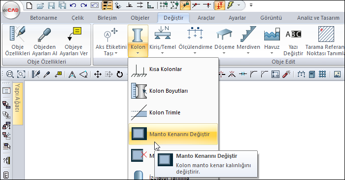 Manto Kenarını Değiştir komutu ile betonarme kolonlarda mantolama yapılır.