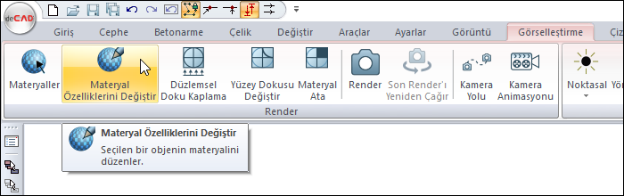 Ayrıca Görselleştirme sekmesi Render başlığında yer alan Materyal Özelliklerini Değiştir komutuna girip perspektif pencerede materyal özelliğini değiştirmek istediğiniz obje üzerine tıklayarak da ulaşabilirsiniz.