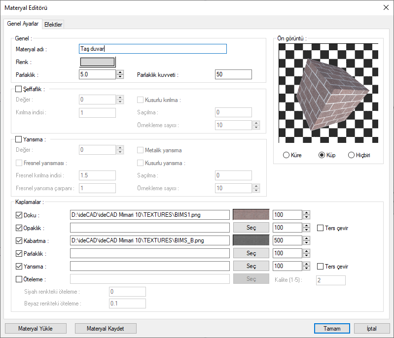 Materyale ideCAD’deki veya elinizdeki texture'ları tanımlamanıza olanak verir. Bu textureları textures klasörü içerisinden seçip kullanabileceğiniz gibi internetten elde edilen texture'lar (paket halinde jpeg, bump ve shinness) da kullanılabilir. ![]() Doku için d, kabartma için bump b, yansıma için s veya r shinness olan texture seçilebilir. ![]() |